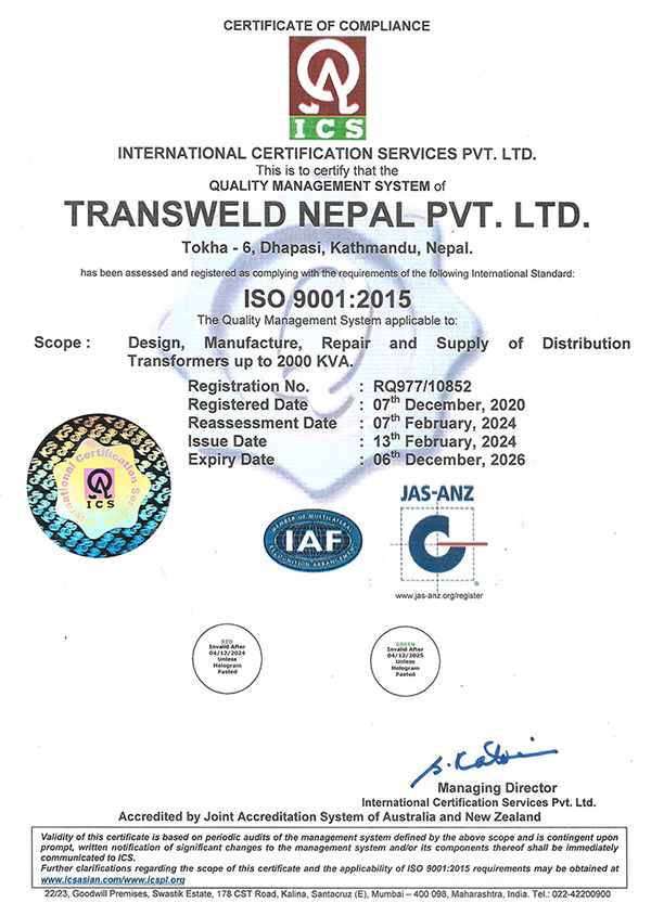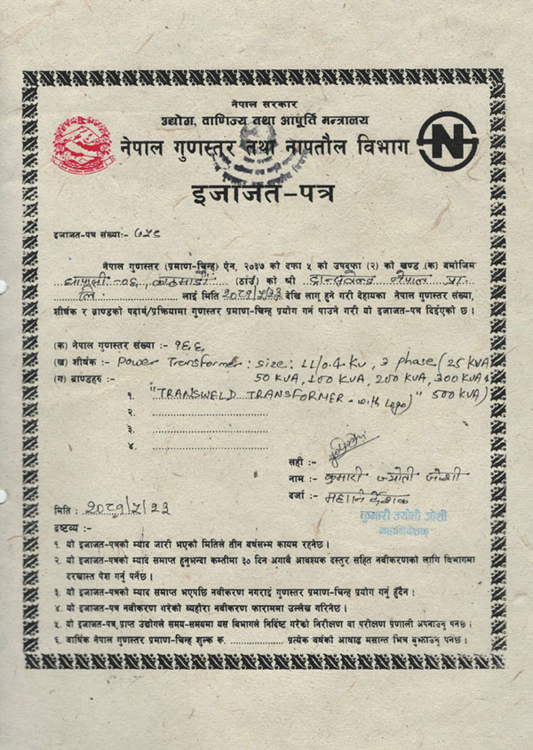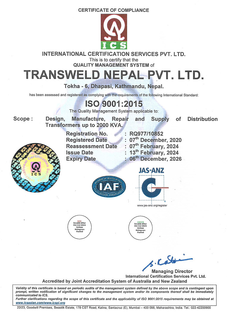 Transweld Nepal provides unmatched after-sales services including lifetime repair and maintenance benefit for our products carried out by highly skilled technicians. We offer our customers 100% quality satisfaction guaranteed with 2-year replacement warranty. Our service technicians visit the customer installation site annually to do a routine check on the performance of the transformers. This service continues even after the warranty period. On call service is also provided.